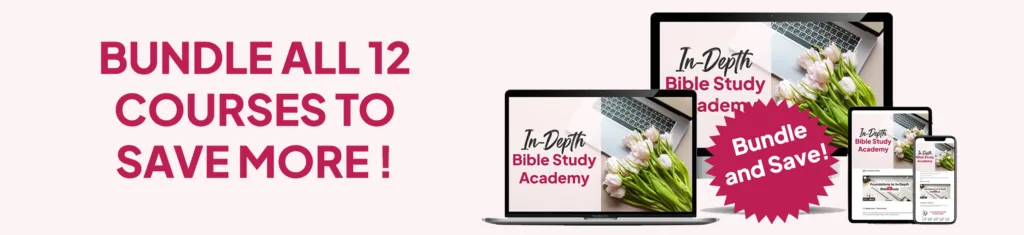 The In-Depth Bible Study Academy is a self-paced bundle of 12 Christ-centered online courses that teach you to read Scripture in context, grasp sound doctrine, and apply God’s Word to everyday life. With video lessons, guided notes, and practical tools, you’ll establish a clear, sustainable study plan and engage the Bible with confidence, purpose, and joy.